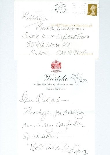 Wartski, royal jewellers and designer of the recent Royal Wedding jewellery, have kindly sent us a personal thank you for assistance with their Managing Director’s computer system. Mr Munn’s note reads: